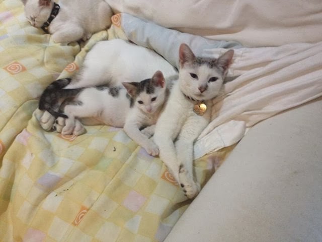 I'm slow. Move slow, think slow, am slow. Today is Tuesday, slow Tuesday. Take cat Mucca on a leash outside onto the porch, he does not like a leash...he is slow. I sit he strains to go somewhere, anywhere where there is no leash restraining him from his cat mind and it's wants. I am slow. I get up, he balks behind the iron planter stand, I talk soothingly to cat (I'm slow remember) he strains to walk behind it and tangle the drip hose in the leash. I pull, he strains, I pull, he strains. He jumps up on the window ledge nearly toppling the planter. Cara stares at him through the window over Kelly's desk disaster. I relent in my quest and Mucca returns inside to scratch himself and terrorize his mother 'til she growls and he slinks away to sit onto of a leaning pile of books and stare.
